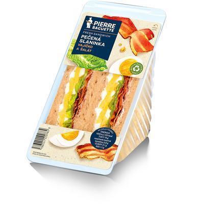 tmavý chlieb, majonézová nátierka, pečená anglická slanina, varené vajce a čerstvá osviežujúca zelenina